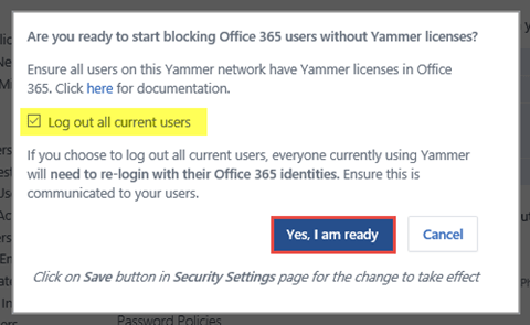 - Once you are enforcing Office 365 Identities, you can go ahead and click the option to block Office 365 users without Yammer licenses. Once again, you’ll have the option to log all users out of Yammer, so plan your changes and communication accordingly. Note that you can enable both of these options at the same time – you don’t need to wait in between selecting the different options.