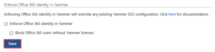 Now that you’ve got your identities consolidated to Office 365, and are blocking Office 365 users without Yammer licenses, simply log back in to Office 365, deselect the Yammer Enterprise option, and click Save.