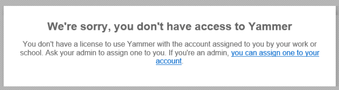 Now when a user without a Yammer license attempts to connect to Yammer by logging in at http://yammer.com, this is what they’ll see: