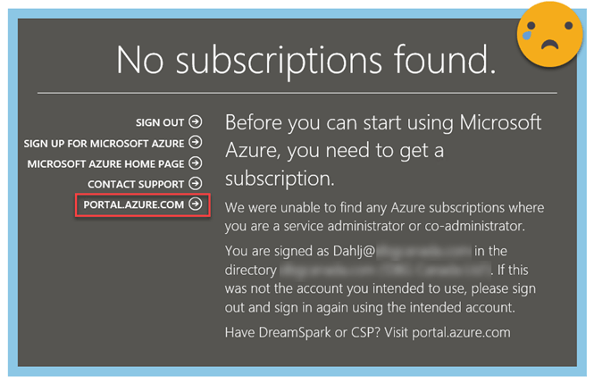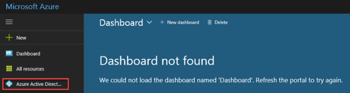Instead of going through all that mess, and signing up for an Azure trial you don’t need, simply navigate to https://portal.azure.com, and click on Azure Active Directory: (ignore this error about your dashboard not found, it doesn’t matter)