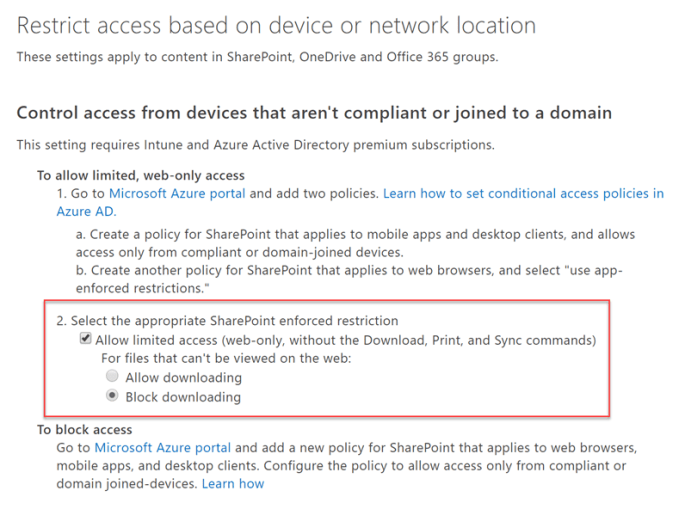 The first option is the two policies we just enabled in Azure AD Premium, and option two actually sets the SharePoint restrictions that we’re looking for.