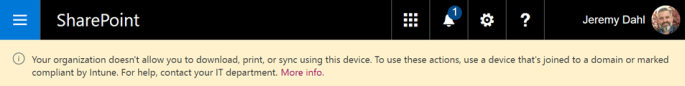 Once these policies have been applied, users will see the following banner when accessing a SharePoint or OneDrive document library, as well as when access OneNote notebooks in SharePoint Online: