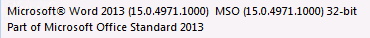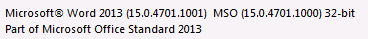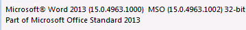 Here’s what to look for: Office 2013 SP1 installs at Version 15.0.4569.1506 (SP1). This is what you’d call a vanilla install – no patches applied yet.