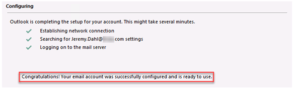 And now, finally… Outlook will connect and set up your user’s profile and email will begin to flow yet again.