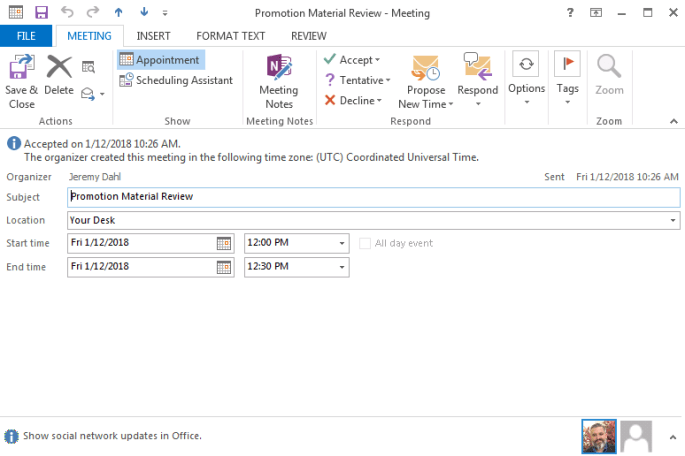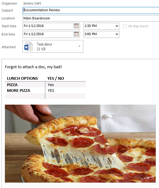 Then I went back and added a document, table, and image to the meeting request (might as well do them all, right?)and sent out the update: