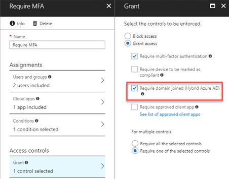 Anyway, we’re here to talk about the third requirement – Hybrid Azure AD join. This is a great option for enforcing corporate compliance, as it requires a device to be joined both to your Active Directory on-prem, as well as Azure AD. Note that simply taking a BYOD device and joining it to Azure AD does not fit this requirement – it has to be joined in both places in order for it to be considered hybrid AD joined. If you’re shooting for a more self-service option, this is not it – typically only admins can join a workstation to AD, so your end users will not be able to set themselves up and become a trusted device on their own. However, if you’re trying to lock down your environment and prevent personal devices from connecting to your corporate data, this is the option for you!