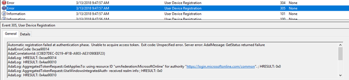 If your device isn’t joining, you’re more than likely going to find Event ID 304 and Event ID 305, which are remarkably unhelpful: