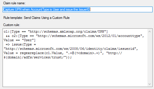 => issue(Type = "http://schemas.microsoft.com/ws/2008/06/identity/claims/issuerid", Value = regexreplace(c.Value, ".+@(?<domain>.+)", "http://${domain}/adfs/services/trust/"));