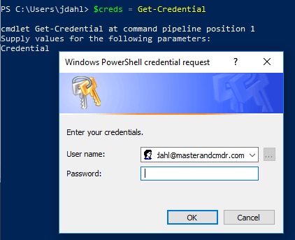 Connecting like this will open an interactive auth window for you to type in your username and password (Modern Auth) – don’t forget to add the -username or -credentials if you want to reduce the typing you need to do when authenticating.