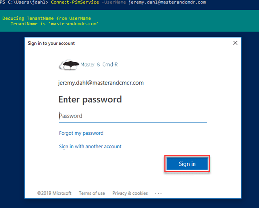 Now that you’re all ready to go, connect to the PIM Service using Connect-PimService. The connect command supports both the -credentials and the -username switch.