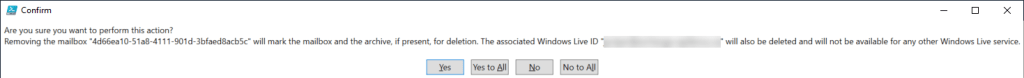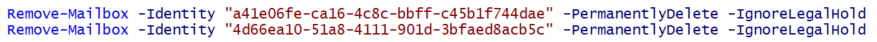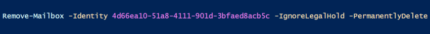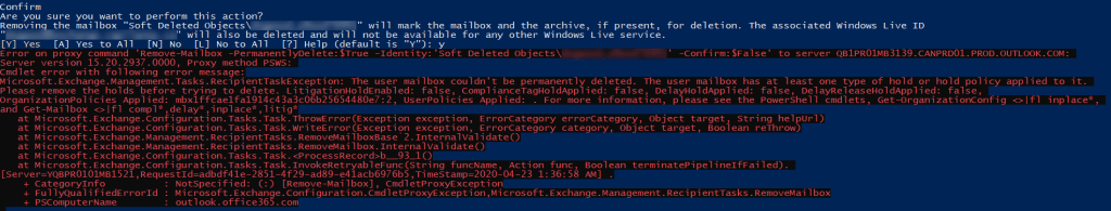 I tried several approaches including trying to exclude the mailbox from the retention policy (didn’t work), applying litigation hold and removing it (no dice), and then I was going to attempt to restore the mailbox, remove it from the policy, and then delete it again – thankfully, I found a better way! There’s an -IgnoreLegalHold switch you can use, which will still allow you to delete the offending mailboxes: