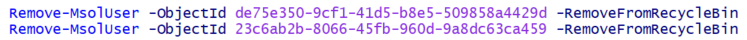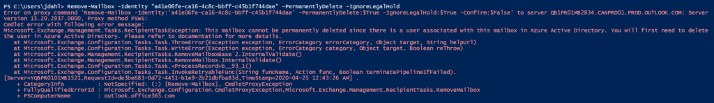 Now, you’d think I was done, but not quite! Two of the four mailboxes hadn’t been properly deleted from the Deleted Users container in Azure AD, so Exchange would not allow me to delete the mailboxes: