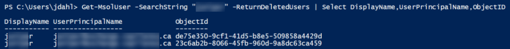 Thankfully, this one is a bit easier – I’ve had to do this one quite often. Start out by searching for your deleted users – in this case I used a search string, because as you can sort of see from the screenshot below, I had two identical users in Azure AD – same Display name, same User Principal Name, and of course… Different Object Ids.